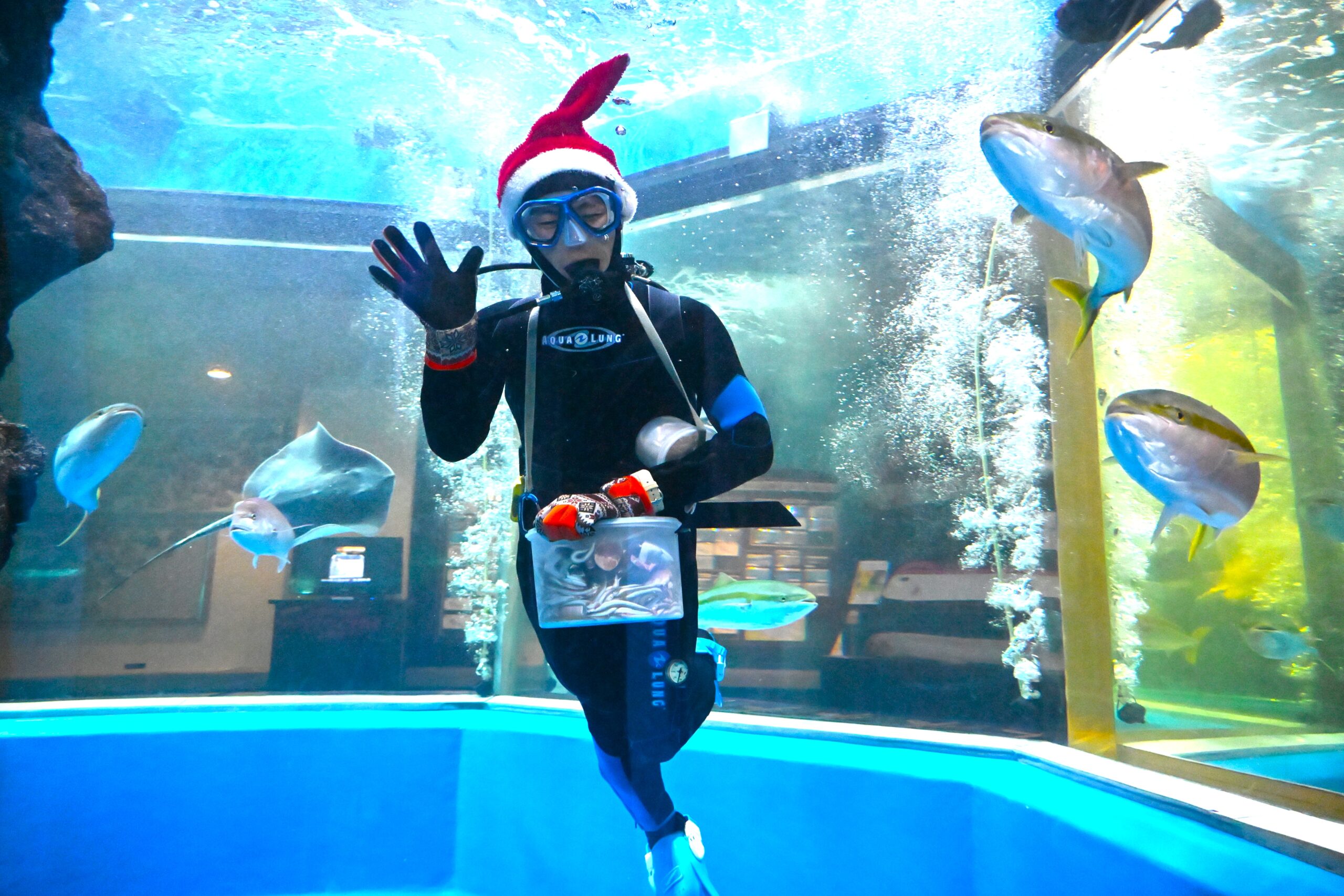大人気、飼育員さんによるエサやりの時間(クリスマスバージョン)
