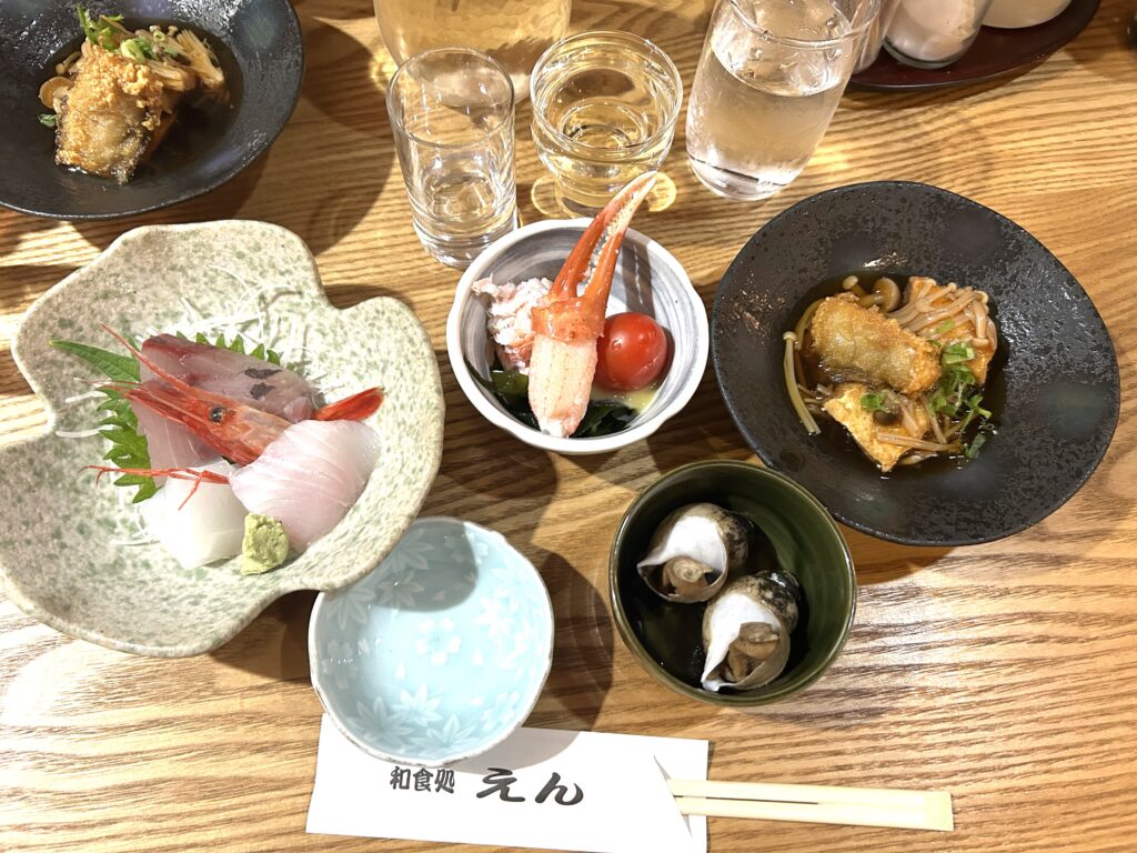 夕方からは、魚津駅前の飲食店「和食処 えん」「銀河食堂 掛」の2店舗を、2グループに分かれてはしご酒形式で巡りました。「和食処 えん」では、魚津酒造の穂波と北洋の飲み比べや刺身、バイ貝の煮物などが提供され、「やっぱり富山の魚は美味しいね」「バイ貝の身の取り方が分からないね」と、参加者同士で会話を楽しみながら食事をする様子が見られました。