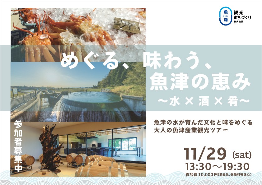 今回のツアーは、”水循環の街・魚津”が育む「水」と、この水の恵みから生み出される「酒」や「肴」をテーマに、地域に根差した観光資源や食文化の魅力を参加者へ伝えます。市内外の参加者がツアーを通じて魚津の魅力に直接触れることで、地元観光資源の再認識や交流人口の増加などにつなげることを目指します。