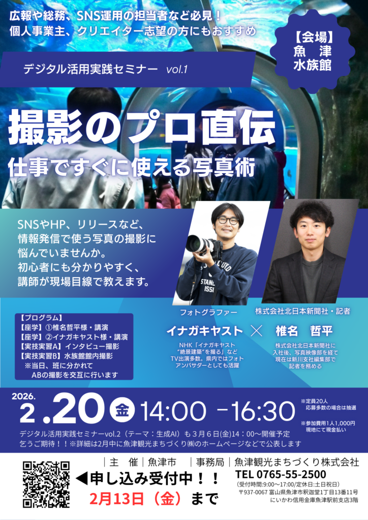 魚津市と当社は2月20日(金)に「撮影のプロ直伝 仕事ですぐに使える写真術」というタイトルで「デジタル活用実践セミナー」の第1弾を開催します。魚津市が主催、当社が事務局を務めます。講師には、株式会社北日本新聞社の写真映像部で報道の第一線に立ち、現在は新川支社編集部で記者としてカメラを構える椎名哲平様、そして、富山県在住で数々のフォトアンバサダーを務められているほか、NHK「イナガキヤスト“絶景建築”を撮る」などでおなじみのイナガキヤスト様にご登壇いただきます。