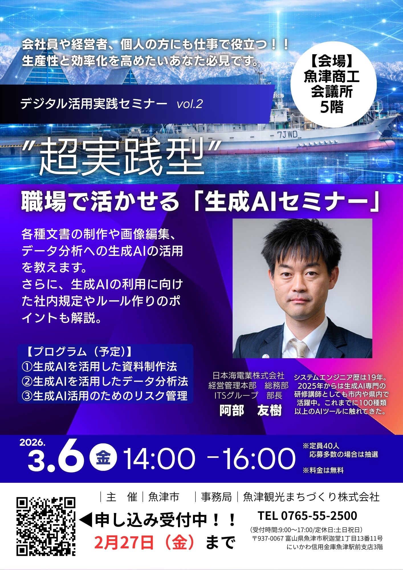 魚津市と当社は3月6日(金)に「“超実践型”職場で活かせる『生成AIセミナー』」を「デジタル活用実践セミナー」の第2弾として開催します。魚津市が主催、当社が事務局を務めます。講師には、これまでに100種類超の生成AIツールを試行してきた日本海電業株式会社・経営管理本部総務部ITSグループ部長の阿部友樹様にご登壇いただきます。阿部様は2025年から生成AI専門の研修講師として市内や県内で活躍され、初心者も分かりやすい講演内容に定評があります。