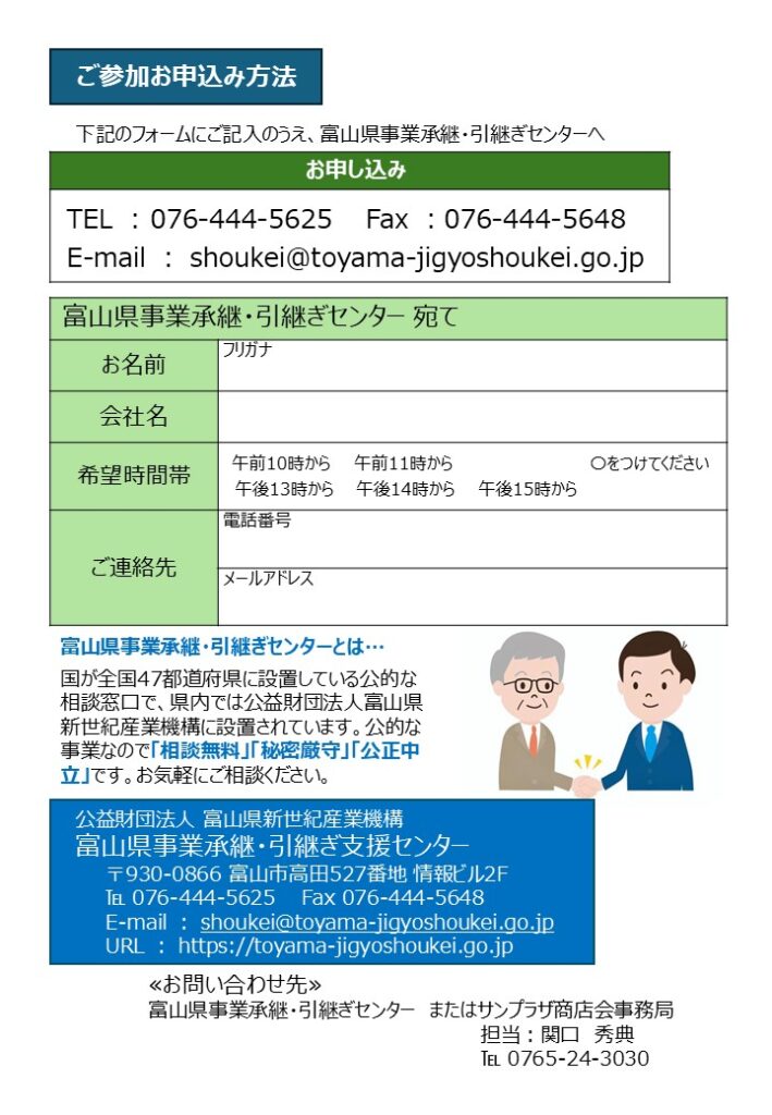 申し込みは下段に掲載した申し込みフォームをご確認ください。また、問い合わせ先は富山県事業承継・引継ぎセンターまたはサンプラザ商店会事務局(0765-24-3030)まで。
