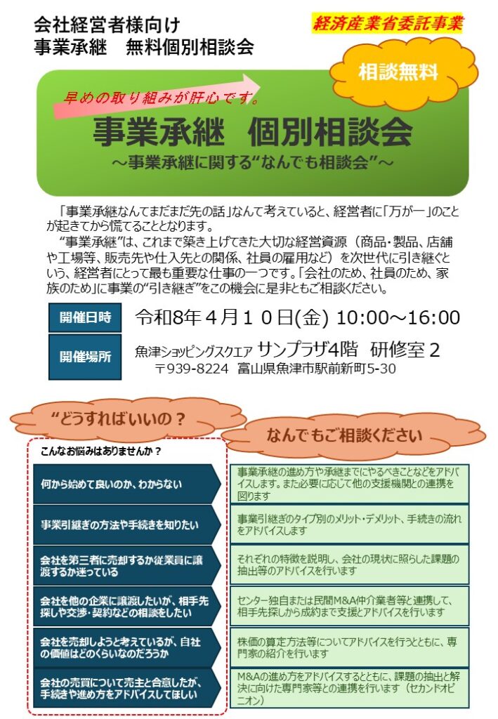 公益財団法人富山県新世紀産業機構 富山県事業承継・引継ぎ支援センターは、2026年4月10日(金)に「会社経営者様向け事業承継無料個別相談会」を予約制で開催します。開催時間は午前10時~午後4時まで、場所は魚津ショッピングスクエアサンプラザ4階研修室2です。