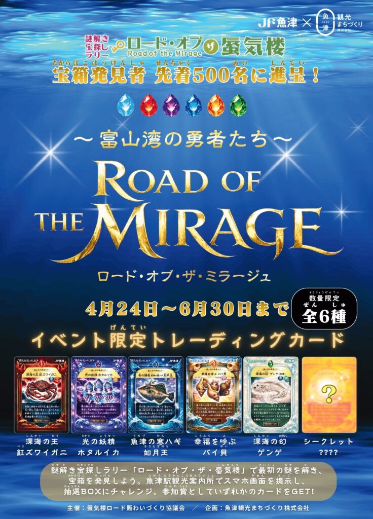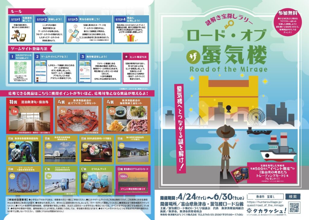 富山県魚津市の海岸線「蜃気楼ロード」沿線を舞台に開催される謎解き宝探しイベント「ロード・オブ・ザ・蜃気楼」(蜃気楼ロード賑わいづくり協議会 代表 魚津漁業協同組合)。いよいよ開催まで残り1週間となりました。本日から公式サイト(株式会社タカラッシュが運営するサイト:ハンターズヴィレッジ内)がオープン。是非、チェックしてみてください。